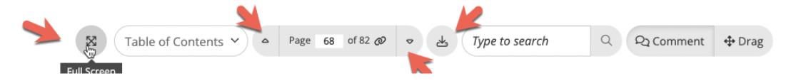 The above image shows the toolbar that is displayed on the page of the document. This will help you easily navigate the document by using the table of contents, page numbers, and the search feature. Additionally, you have the option to download the document (found between the page number and search engine).